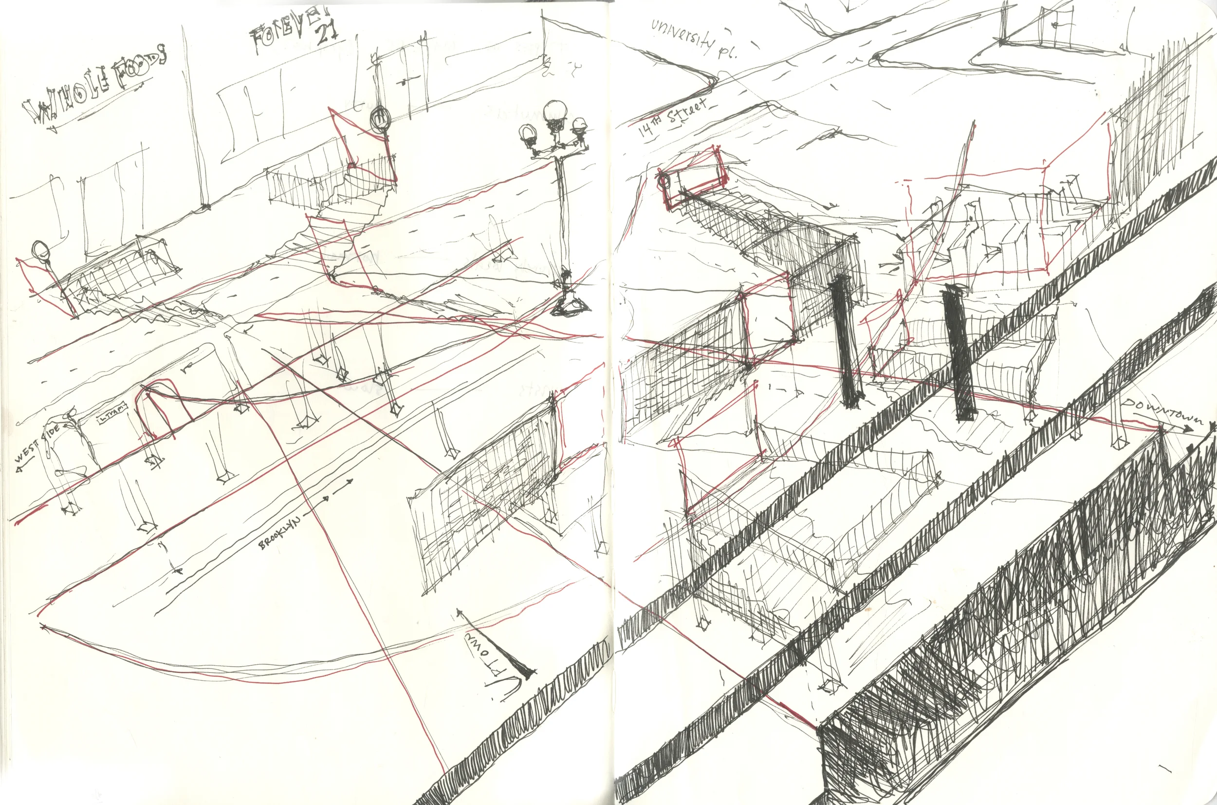 This is a proposal for a network of translational artifacts in Union Square that seek to overlap, overlay, and superimpose the diverse set of movements inherent to the site. These artifacts provide a means of translating oneself in all spatial axes by utilizing the stair: a metaphor for incremental time and an inherently transitional object. The stair artifacts awaken individuals to their own speed of movement and to the complex networks of velocities and itineraries around them. Opportunities of slowness and speed are juxtaposed. Rather than moments of intrusion or intervention, these stair artifacts are interludes along one’s path that internalize and index qualities of light and movement.